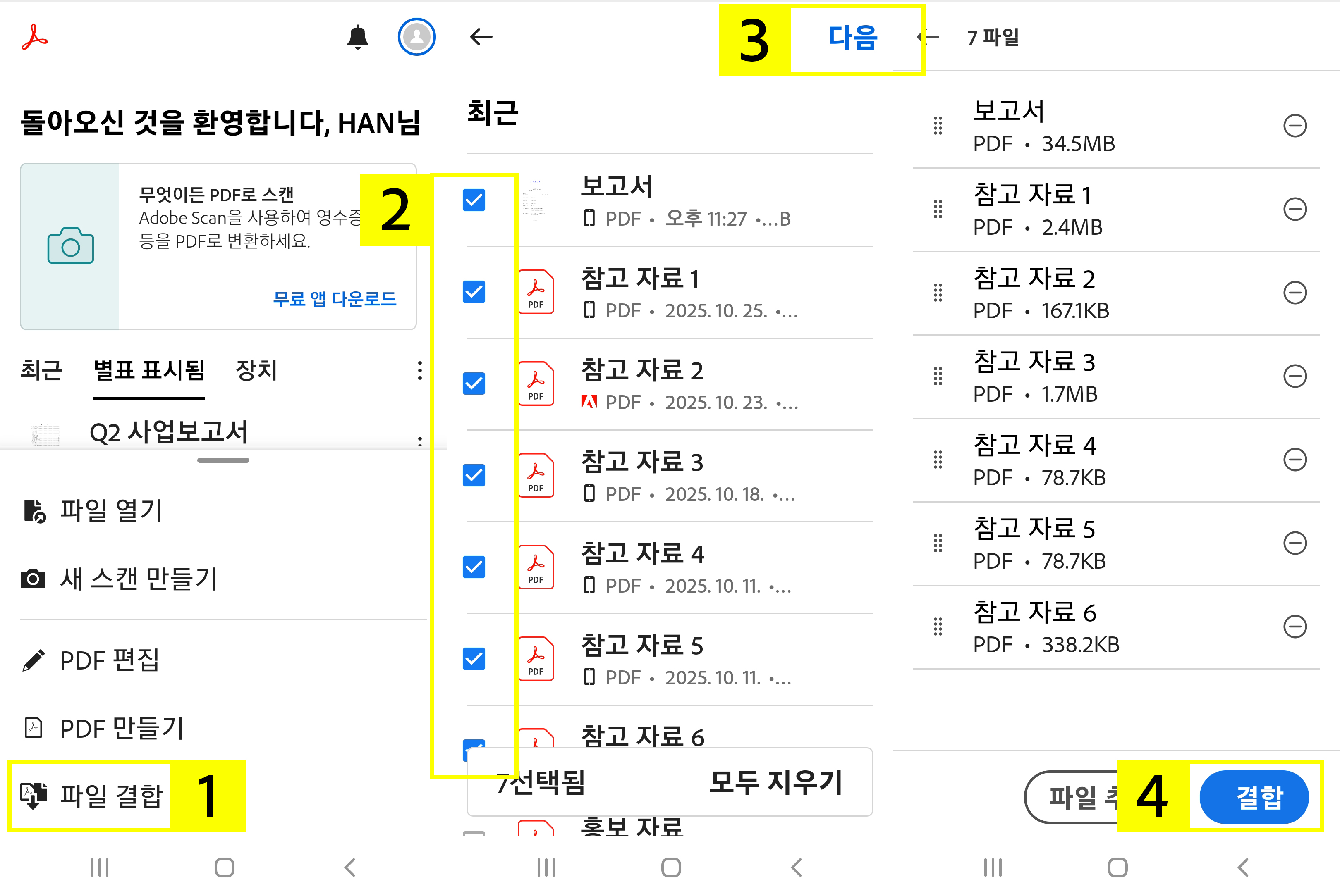 - 애크로뱃 모바일 앱에서 하단 ‘+’ > ‘파일 결합’ 선택