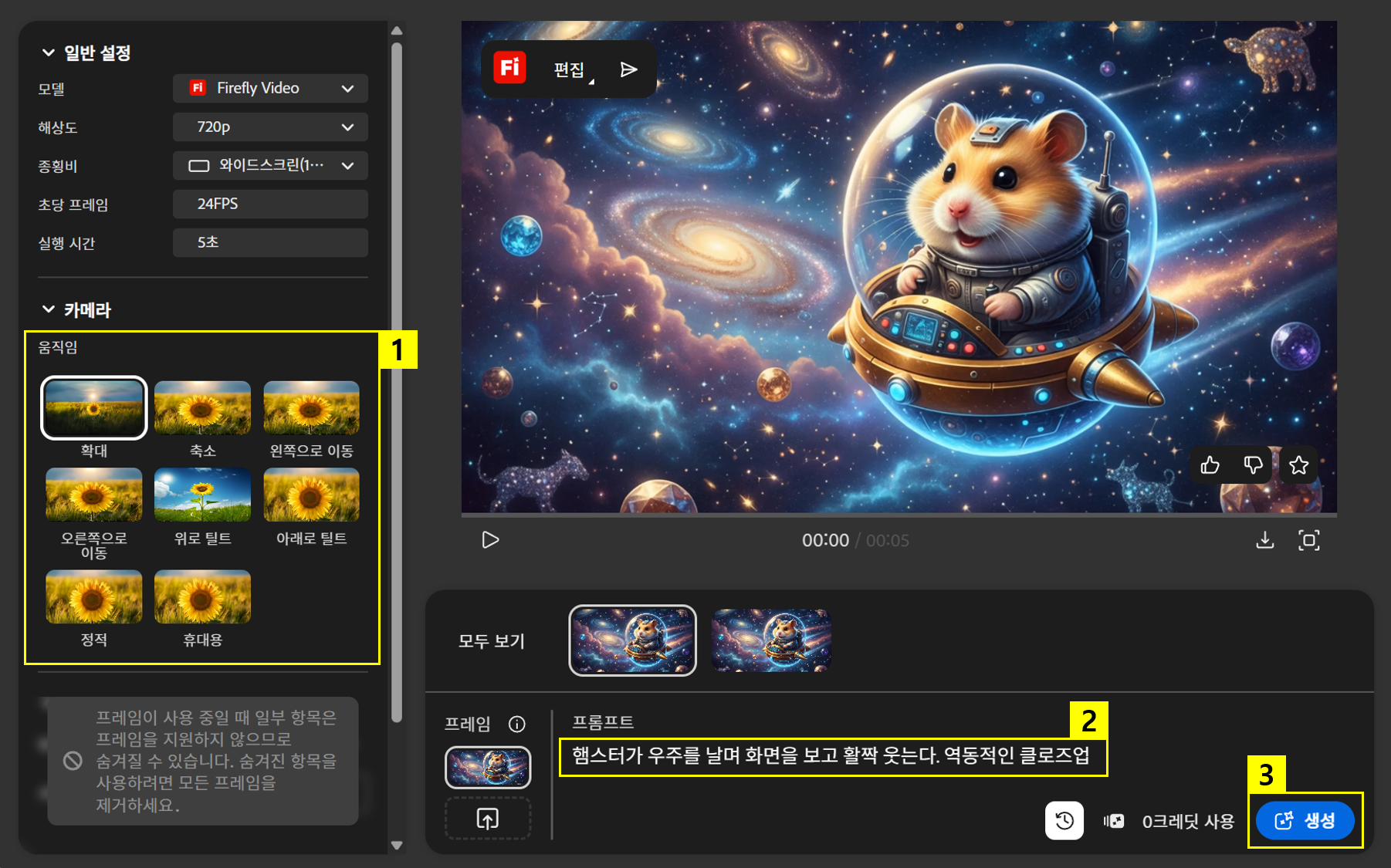 사진으로 동영상 만들기를 시작하려면 먼저 프레임으로 사용할 이미지가 필요합니다. 파이어플라이의 이미지 생성 기능을 활용하면, 원하는 스타일의 이미지를 손쉽게 제작할 수 있어 영상의 분위기를 더욱 풍부하게 연출할 수 있습니다. 이번에는 ‘작은 우주선을 타고 반짝이는 별들 사이를 날아가는 햄스터’ 이미지를 프레임으로 삽입해보겠습니다.
