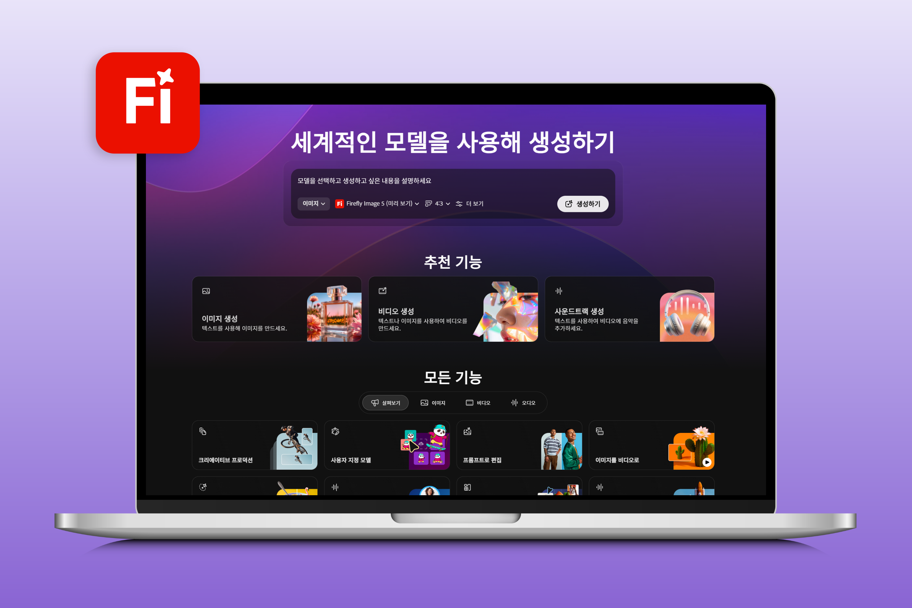 어도비 파이어플라이는 AI 영상 생성을 위한 강력한 도구들을 제공합니다. ‘이미지를 비디오로’ 기능을 통해 정지 이미지를 최대 5초 길이의 1080p 고해상도 동영상으로 변환할 수 있으며, 카메라 앵글, 샷 크기, 카메라 모션 등 다양한 옵션으로 영상에 시네마틱한 효과를 적용할 수 있습니다. ‘사운드 효과 생성하기’ 기능까지 더해져, 텍스트 프롬프트나 음성 입력만으로 영상에 어울리는 사운드 트랙을 생성할 수 있어 완성도 높은 콘텐츠 제작이 가능합니다.