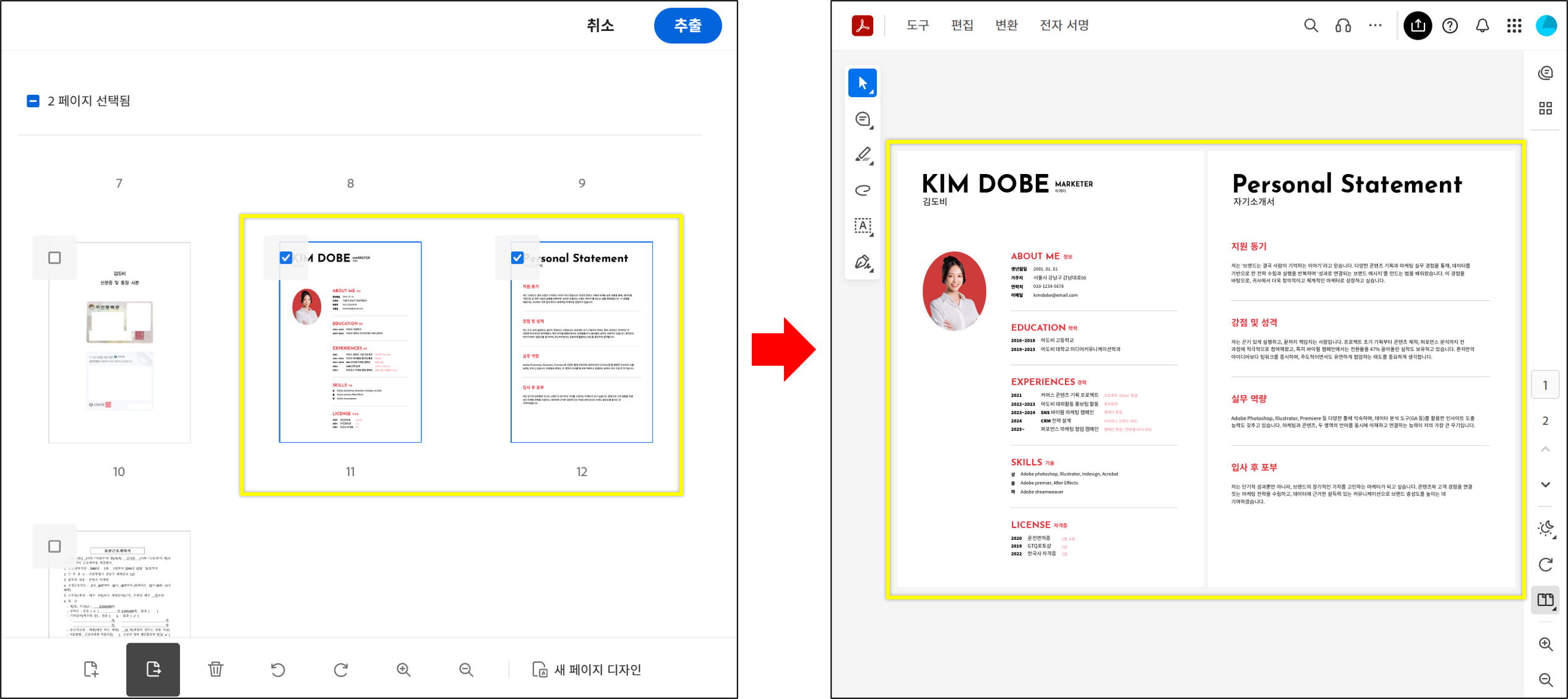 - 추천 업무: 보고서에서 핵심 페이지만 PDF 추출하여 임원 보고용으로 활용, 카탈로그에서 특정 제품 페이지만 추출하여 고객에게 제공, 계약서에서 서명 페이지만 추출