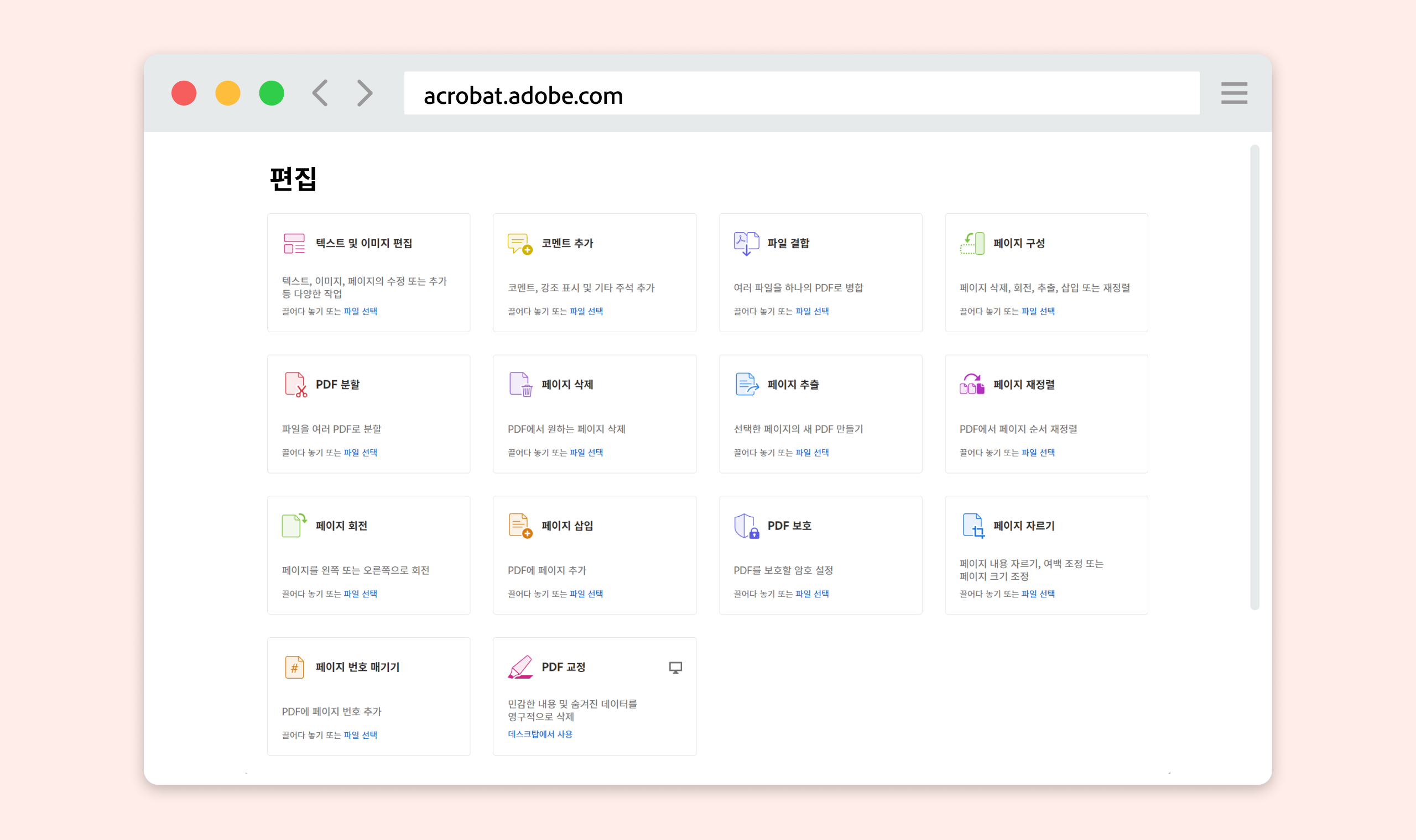 애크로뱃 온라인에서도 페이지 삭제, 회전, 추출 등 기본적인 PDF 편집 기능을 사용할 수 있습니다. 다만 업로드 가능한 파일 크기와 페이지 수에 제한이 있으며, 복잡한 레이아웃 조정이나 고급 편집은 제한적일 수 있습니다. 애크로뱃 데스크탑에서는 대용량 문서나 복잡한 구조의 PDF도 자유롭게 편집할 수 있으므로, 전문적인 문서 작업이 필요하다면 데스크탑 버전을 활용하는 것이 좋습니다.