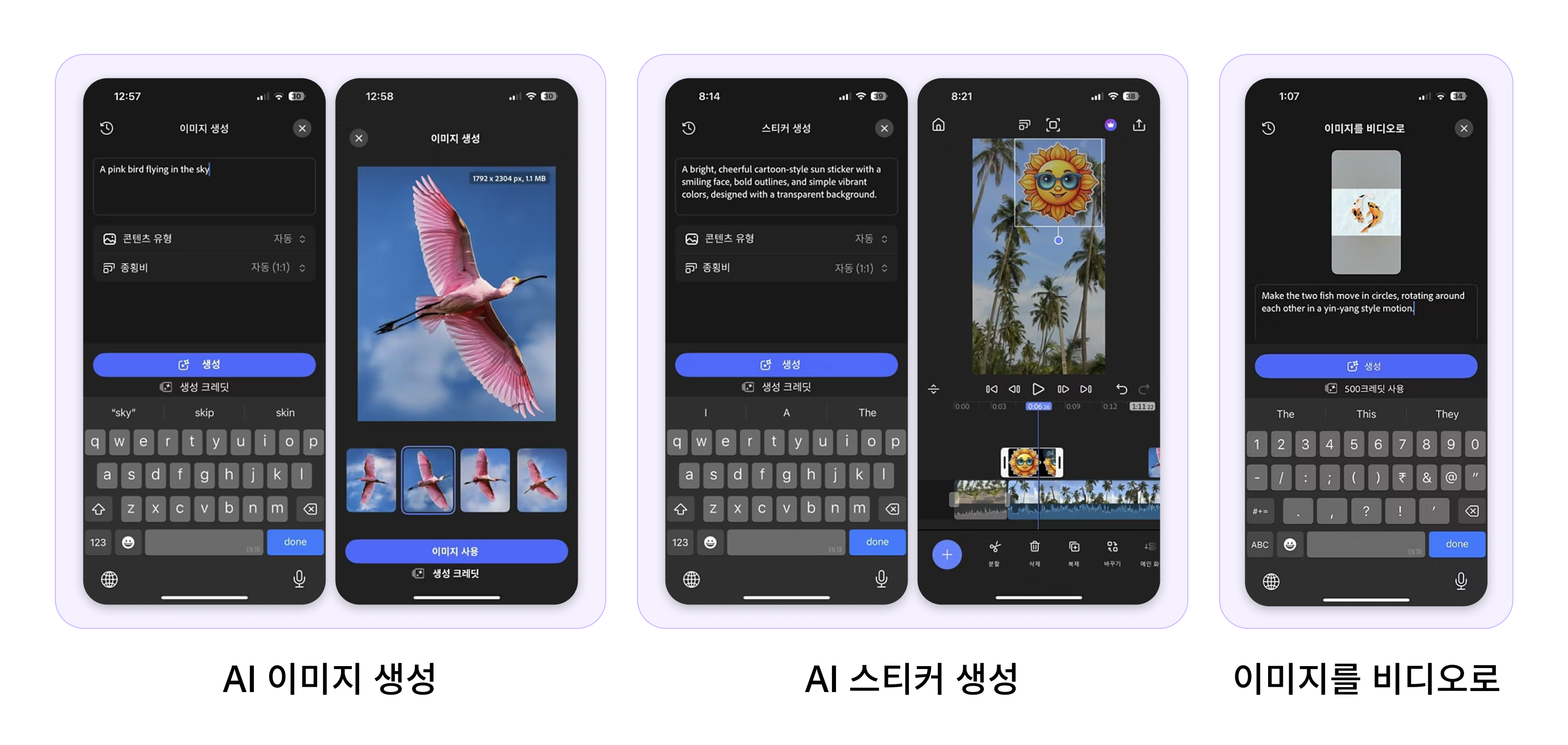 영상편집 앱 프리미어에서는 어도비 파이어플라이(Adobe Firefly) 기반의 생성형 AI 기능으로 독창적인 콘텐츠를 만들어낼 수 있습니다. ‘이미지 생성’ 기능으로 설명만 입력하면 이미지를 생성하고, ‘이미지를 비디오로’ 기능으로 정적 이미지를 움직이는 영상으로 변환할 수 있죠. ‘스티커 생성’ 기능으로는 나만의 독특한 스티커를 제작해 영상에 개성을 더할 수 있습니다. 모든 생성 애셋은 상업적으로 안전하게 사용할 수 있어 비즈니스 콘텐츠 제작에도 적합합니다.